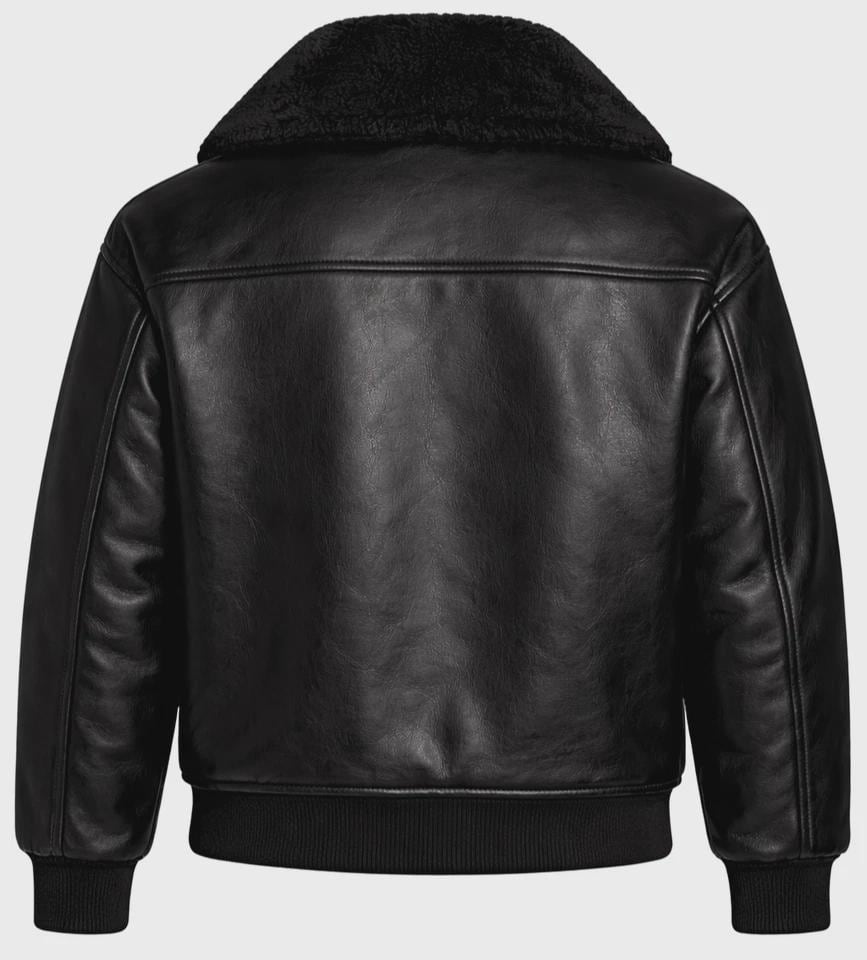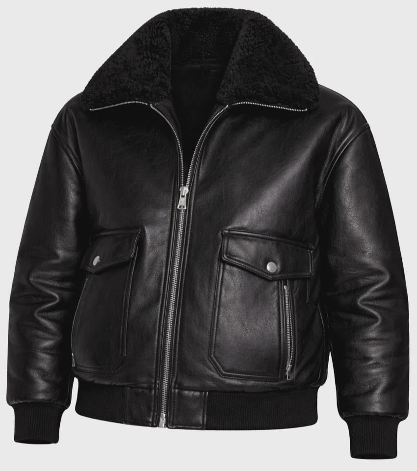 Oversized Black Leather Bomber Jacket with Shearling Collar – Vintage Aviator Street Style Coat