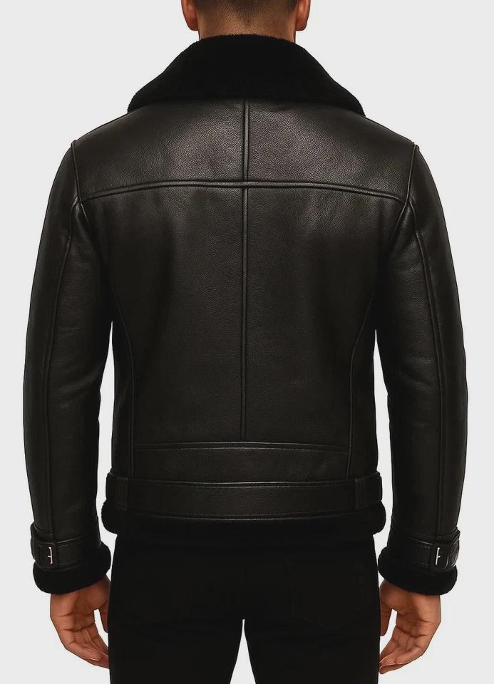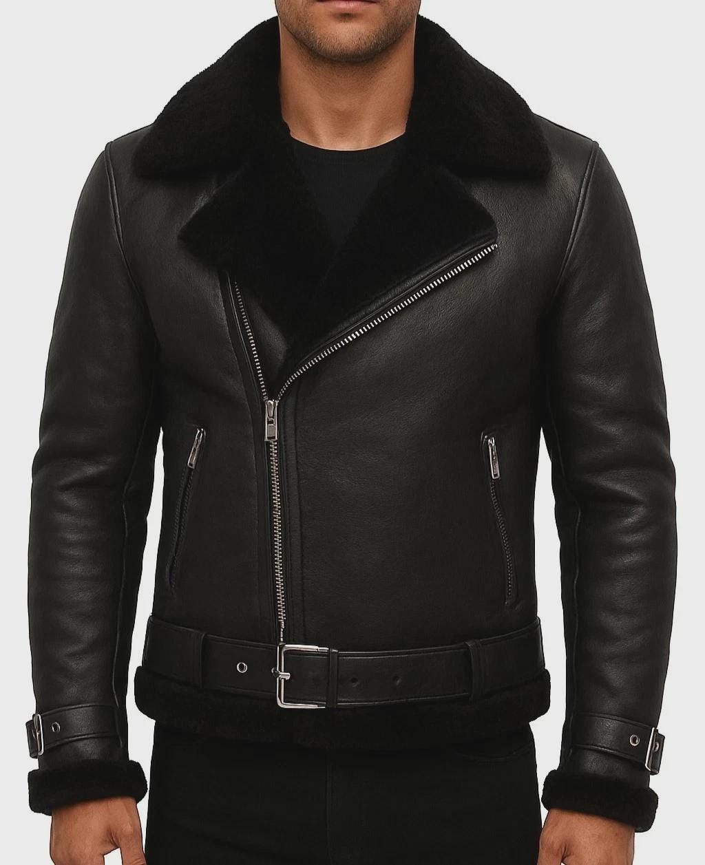 Men's Black Shearling Leather Biker Jacket – Aviator Style Fur Collar Moto Coat